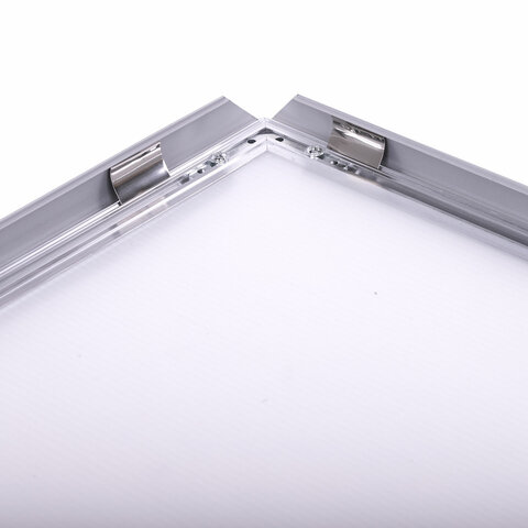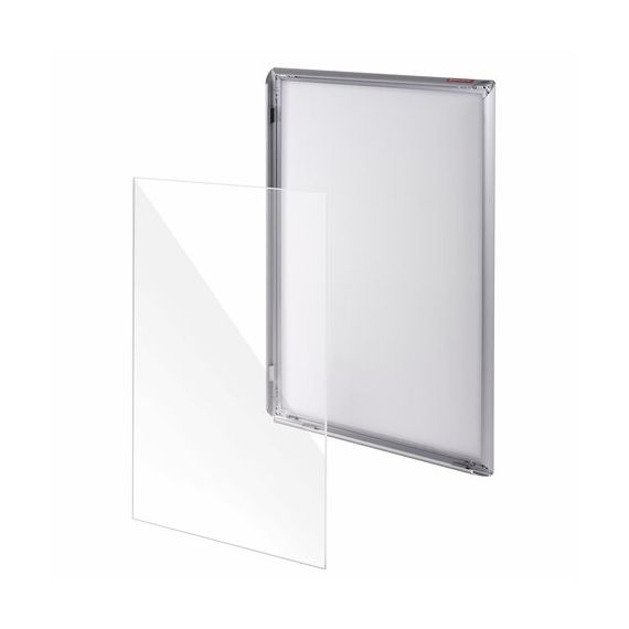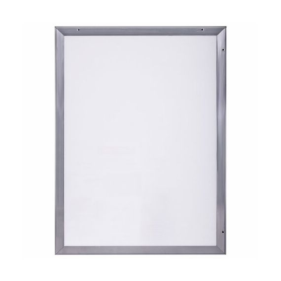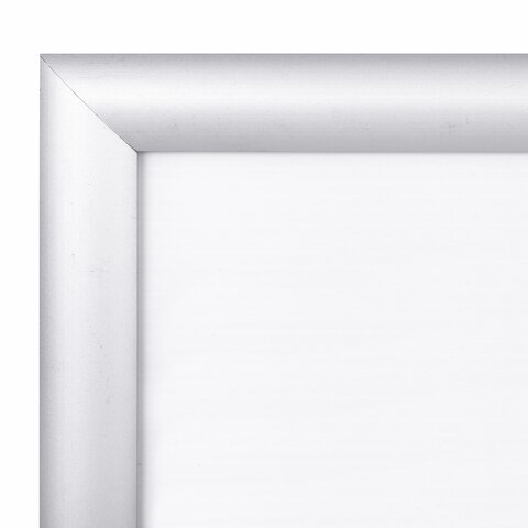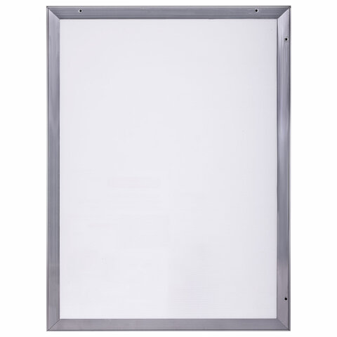 Профиль рамки изготовлен из анодированного алюминия. Изменяемое расположение – книжное или альбомное. Благодаря прозрачному антибликовому покрытию документы отчётливо видны посетителю, не мнутся и не загрязняются в течение всего эксплуатационного периода. Рамка крепится к стене через специальные отверстия при помощи дюбелей и саморезов. Элементы крепления входят в комплект. Максимальная высота вставляемого листа – 594 мм, максимальная ширина вставляемого листа – 420 мм. Цвет рамки - матовое серебро. Ширина багета – 2,5 см.