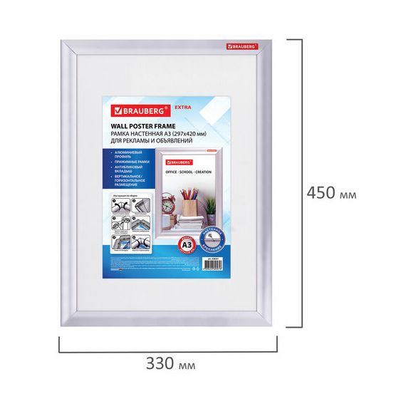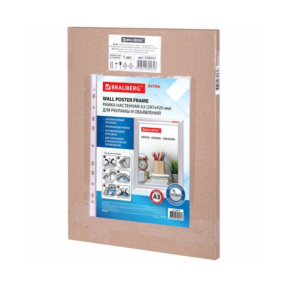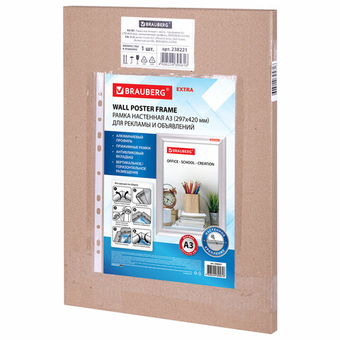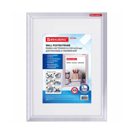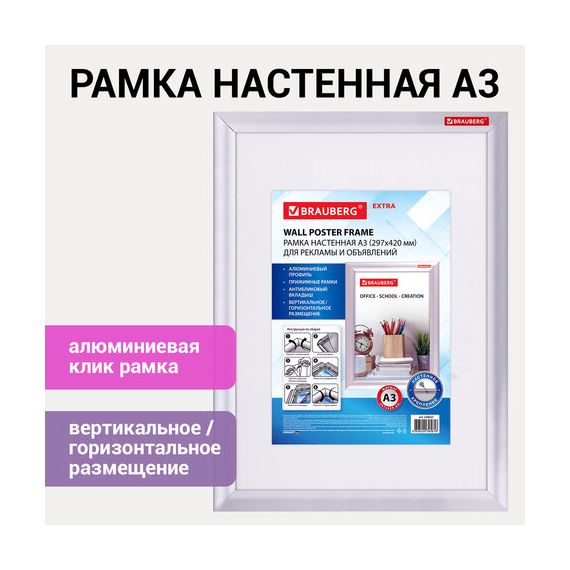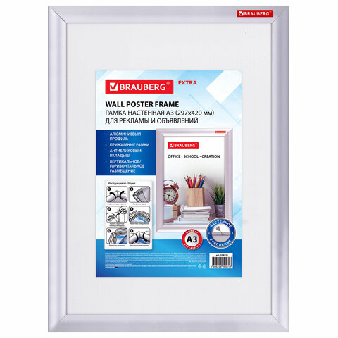 Рамка настенная с "клик"-профилем А3 (297х420 мм), алюминиевый профиль, BRAUBERG "Extra", 238221