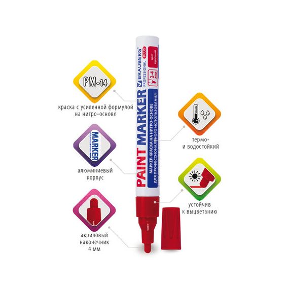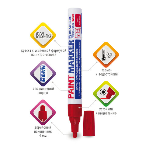 Маркер-краска лаковый BRAUBERG предназначен для маркировки различных материалов в промышленных условиях: бетона, дерева, стекла, металла, резины, пластика. Заправлен краской с усиленной формулой на нитро-основе РМ-14.
