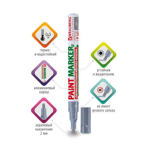 Маркер-краска лаковый (paint marker) 2 мм, СЕРЕБРЯНЫЙ, БЕЗ КСИЛОЛА (без запаха), алюминий, BRAUBERG