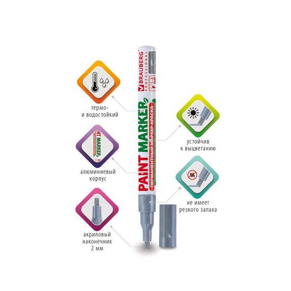 Маркер-краска лаковый BRAUBERG предназначен для маркировки различных материалов в промышленных условиях: бетона, дерева, стекла, металла, резины, пластика. Также подходит для творчества и декорирования.