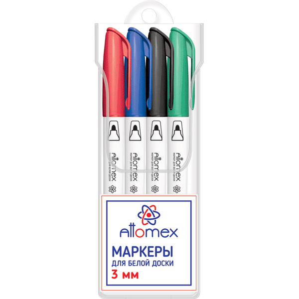 Набор маркеров для белой доски "Attomex" (04 цв - красн, син, черн, зел) круглый корпус с клипом, пулевидный наконечник, ширина линии до 4 мм, в картонном блистере
