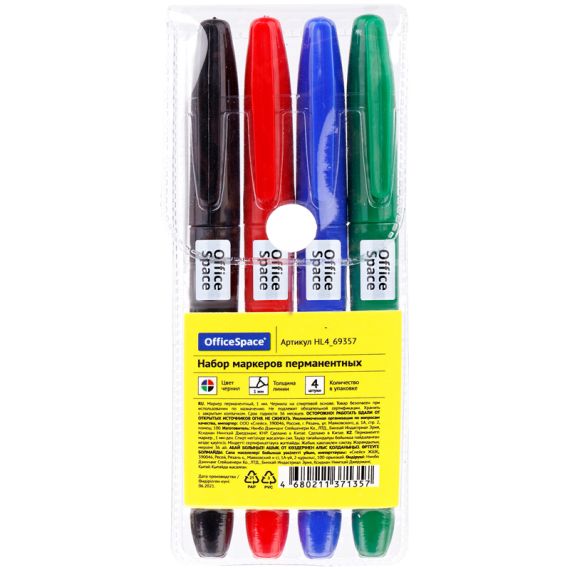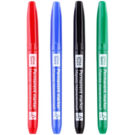 Набор маркеров OfficeSpace подходит для письма на любых поверхностях. Чернила на спиртовой основе. Ширина линии может варьироваться от 1 мм до 3 мм в зависимости от силы нажатия. Длина письма 400-500 м. Плотный колпачок с клипом надёжно предотвращает высыхание. Цвет колпачка соответствует цвету чернил. Пулевидный пишущий узел. В наборе 4 цвета: красный, синий, зелёный, чёрный.