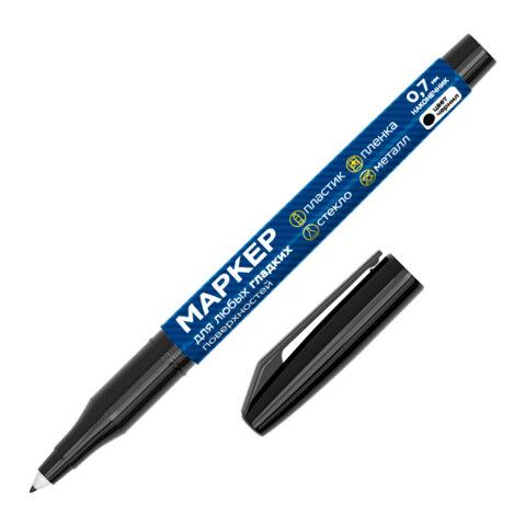 Маркер для гладких поверхностей черного цвета обладает круглой формой корпуса из пластика, диаметр – 13 мм. Толщина линии письма составляет 0,7 мм – это особенно удобно для деликатных задач, таких как высокоточная маркировка лабораторных пробирок, нанесение меток на пленки, подписание мелких деталей и кабелей.