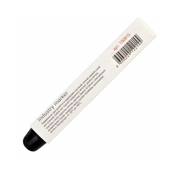Корпус маркера черного цвета выполнен из бумаги и имеет диаметр 18 мм. Благодаря специальной формуле твердая краска-маркер быстро формирует оксидную пленку и становится устойчивой к агрессивным атмосферным воздействиям. Не окисляется, его пишущие характеристики не меняются по мере использования. Водостойкие чернила быстро сохнут, обладают антикоррозионными свойствами. Диапазон рабочих температур: от -20 ° C до +40 ° C. Маркер не содержит свинец, не токсичен. Наконечник круглой формы создает линию письма толщиной от 5 до 18 мм.