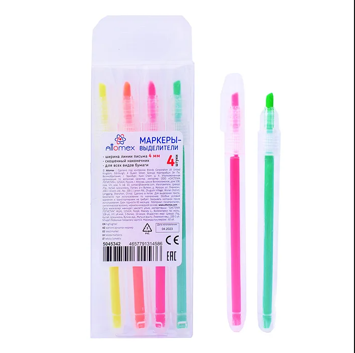 Набор маркеров-выделителей "Attomex" (04 цв - желт, зел, оранж, роз) круглый корпус, скошенный након