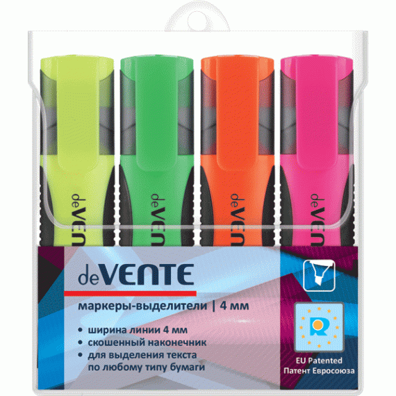 Набор маркеров-выделителей "deVENTE" (04 цв - желт, зел, оран, роз) плоский корпус с каучуковыми вставками, с клипом, скошенный наконечник, ширина линии 1-5 мм, в пластиковом блистере