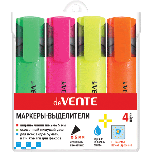 Набор маркеров-выделителей "deVENTE" (04 цв - желт, зел, оран, роз) плоский корпус, скошенный наконечник, ширина линии 1-5 мм, в пластиковом блистере