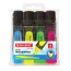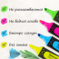 В наборе четыре неоновых цвета: желтый, зеленый, голубой и розовый. Плоская форма корпуса, диаметр которого 25 мм. Резиновые вставки обеспечивают эргономичную зону захвата, предотвращая скольжение в процессе использования. Скошенный наконечник имеет толщину линии письма от 1 до 5 мм, что обеспечивает удобство при работе с текстом, напечатанным мелким шрифтом, или таблицами. Благодаря особой водной основе чернил текстовыделители не высыхают без колпачка в течение 8 часов. Текстовыделители обладают экономным расходом чернил, при этом длина линии письма достигает 300 метров. Чернила быстро впитываются, предотвращая размазывание. Цвет корпуса соответствует цвету чернил.