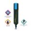 Текстовыделитель голубого цвета имеет плоскую форму корпуса, диаметр которого 25 мм. Скошенный наконечник имеет толщину линии письма от 1 до 5 мм, что обеспечивает удобство при работе с текстом, напечатанным мелким шрифтом, или таблицами. Благодаря особой водной основе чернил текстовыделитель не высыхает без колпачка в течение 8 часов. Текстовыделитель обладает экономным расходом чернил, при этом длина линии письма достигает 300 метров. Чернила быстро впитываются и тем самым предотвращают размазывание в процессе использования. Светоустойчивые чернила не выцветают даже на открытом солнце. Цвет клипа текстовыделителя соответствует цвету чернил.