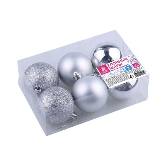 Шары ёлочные 6 шт., 8 см, "Trio", пластик, СЕРЕБРИСТЫЕ (глянец, матовый, глиттер), ЗОЛОТАЯ СКАЗКА