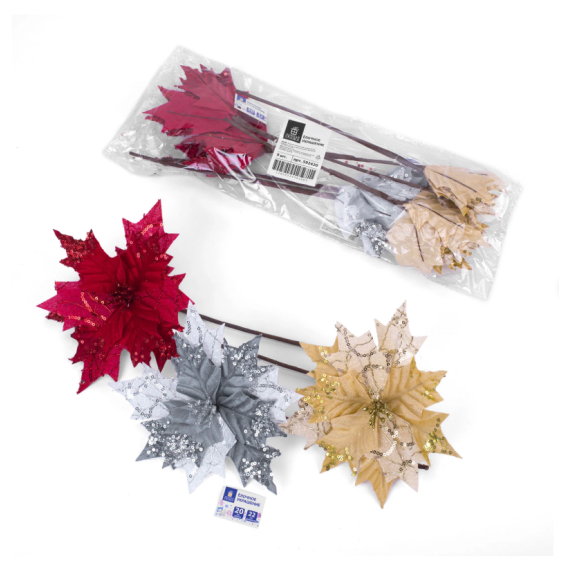 Поставляется в 3 цветах (без возможности выбора): золотистый, серебристый, красный. Диаметр украшения – 22 см, длина – 20 см. Материал – пластик, полиэстер, металл. Каждый цветок с цветной бумажной этикеткой.
