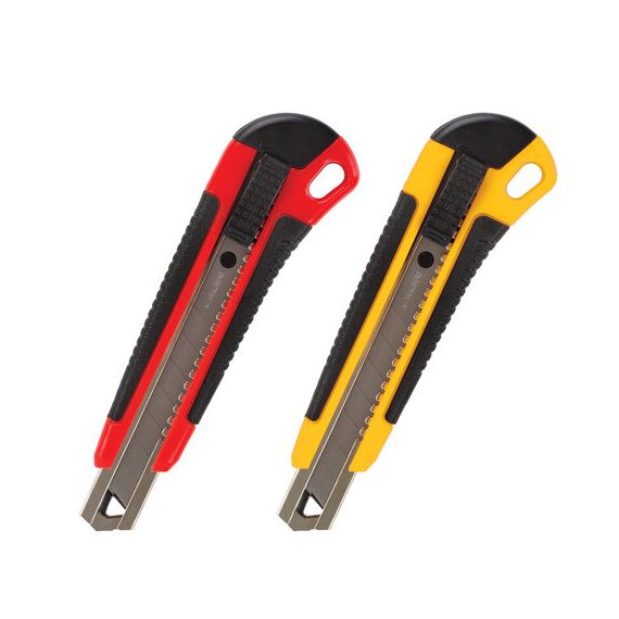 Легкий пластиковый корпус с металлическими направляющими надежно удерживает остро отточенное лезвие стандартной ширины 18 мм. По мере использования отработанные концы лезвия просто отламываются. В комплект входят 2 запасных лезвия, расположены в корпусе ножа. Дизайн корпуса эргономичный. Резиновые края ручки предотвращают скольжение пальцев, исключают их травмирование. Для удобства хранения имеется отверстие для подвеса. Яркая расцветка выделяет инструмент среди других подобных, нож упакован в блистер с европодвесом. Поставляется в нескольких вариантах цвета (без возможности выбора).