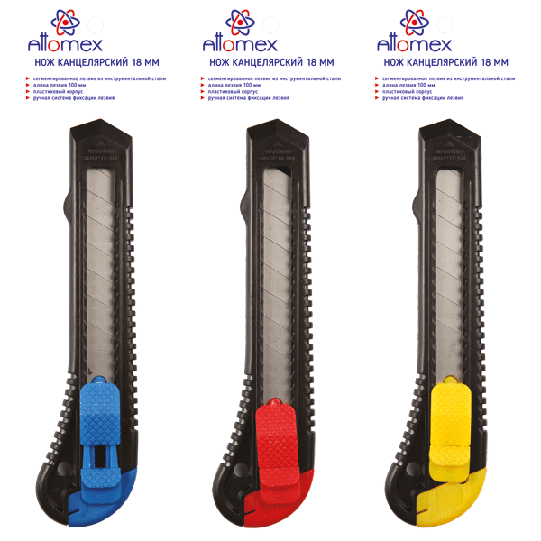 Нож канцелярский "Attomex" 18 мм, пластиковые направляющие, ручная блокировка лезвия, пластиковый бл