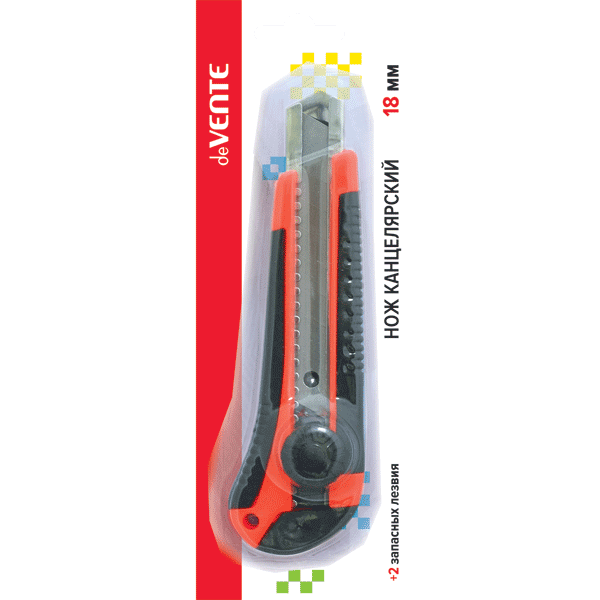 Нож канцелярский "deVENTE" 18 мм, c 2-мя запасными лезвиями, металлические направляющие, ручная блокировка лезвия, каучуковые вставки, картонный блистер, черный с красным