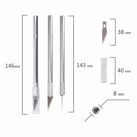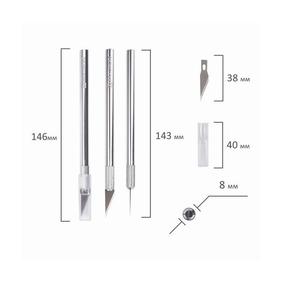 Ультратонкое металлическое лезвие с заостренным кончиком закрывается колпачком по окончании работы. Ширина лезвия составляет 8 мм. Поставляется в блистере с европодвесом. 5 запасных лезвий в комплекте.