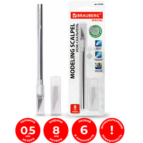 Нож макетный (скальпель) BRAUBERG "Special", 6 лезвий в комплекте, металлический корпус, блистер