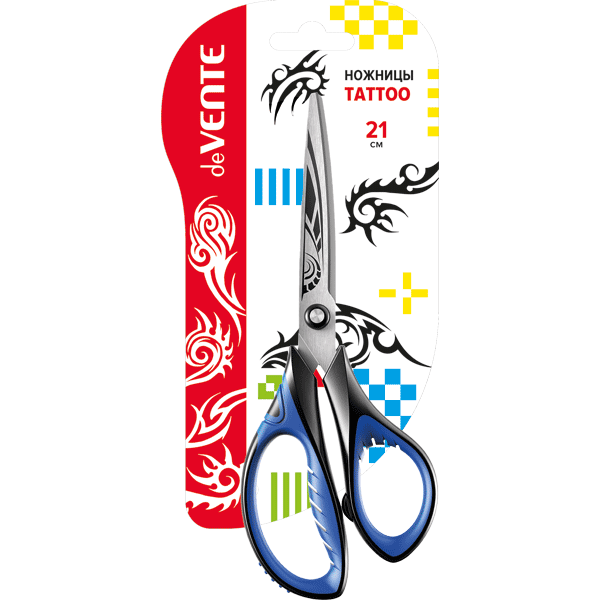 Ножницы канцелярские "deVENTE. Tattoo" 21 см, двухцветные прорезиненные кольца с лепестками, протравленная гравировка на лезвиях, в картонном блистере