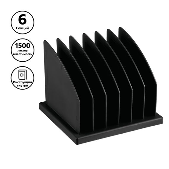 Лоток-сортер 6 отделений для бумаг форматов А4, А5. Современный дизайн, быстрая и легкая сборка. Возможна установка перегородок в вертикальном и горизонтальном положениях. Удобная конструкция предусматривает регулировку ширины отделений. Изготовлен из качественного полистирола. Упакован в термоусадочную пленку, поставляется в разобранном виде. Инструкция по сборке в комплекте. Цвет лотка - черный.