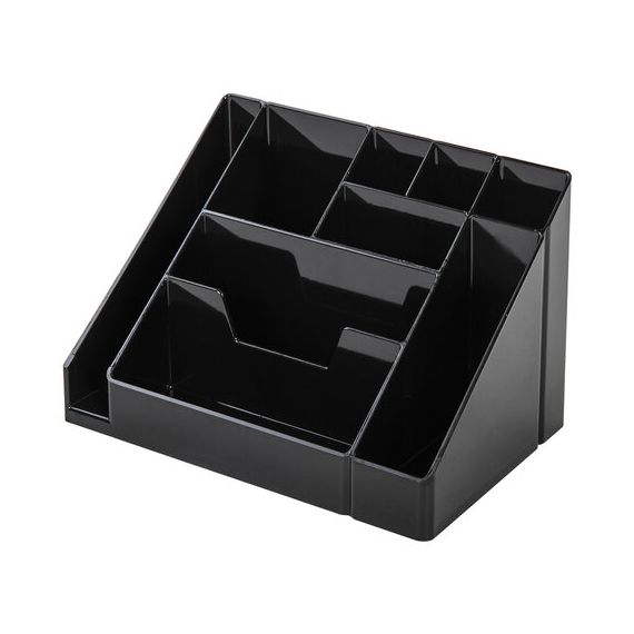 Изготовлена из высококачественного пластика. Имеет размеры 115х160х105 мм. Состоит из 9 отделений для канцелярских мелочей и пишущих принадлежностей. Поставляется без наполнения.
