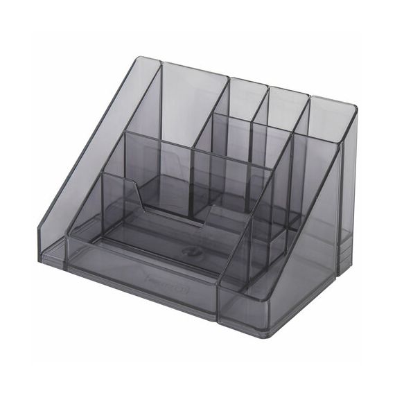 Изготовлена из высококачественного пластика. Имеет размеры 115х160х105 мм. Состоит из 9 отделений для канцелярских мелочей и пишущих принадлежностей. Поставляется без наполнения.