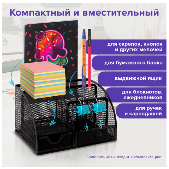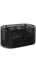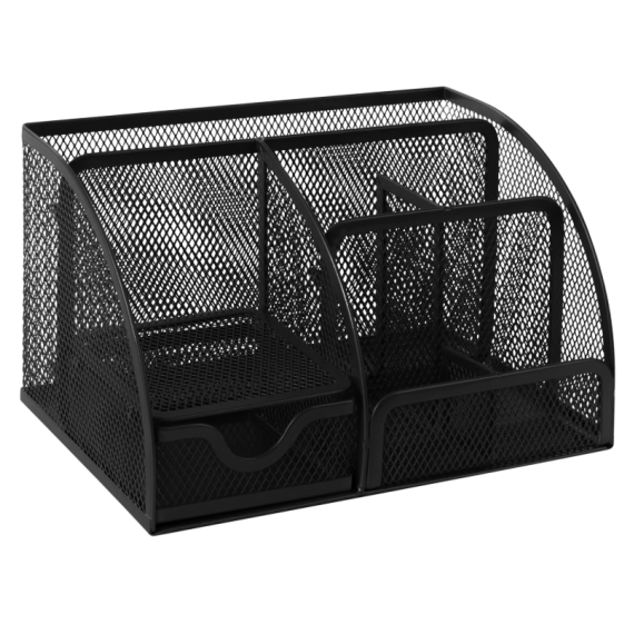 Изготовлена из металлической сетки. Имеет размеры 125х220х140 мм. Выполнена в черном цвете. Состоит из 7 секций, которые позволяют хранить и сортировать самые разные канцелярские принадлежности: от блоков для записей и кнопок – до ручек и карандашей. Мягкие подушечки на дне предотвращают скольжение и порчу мебели. Поставляется без канцелярского наполнения.