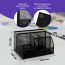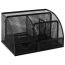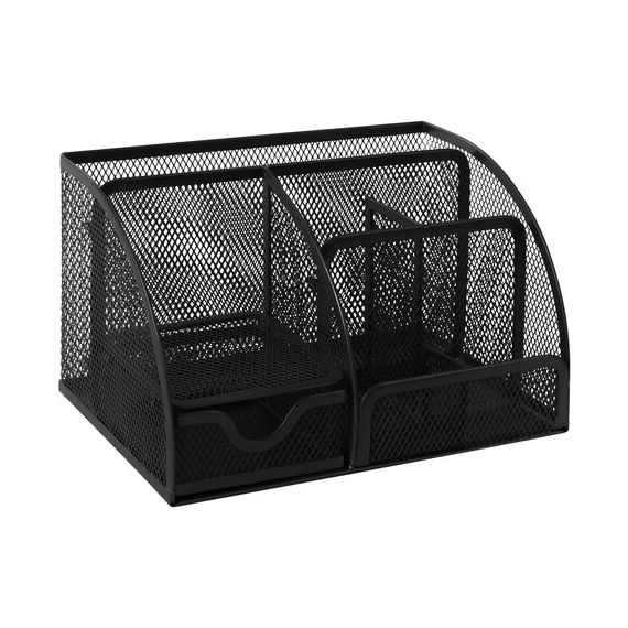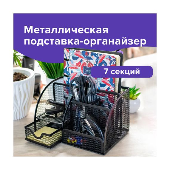Изготовлена из металлической сетки. Имеет размеры 125х220х140 мм. Выполнена в черном цвете. Состоит из 7-ми секций, которые позволяют хранить и сортировать самые разные канцелярские принадлежности: от блоков для записей и кнопок - до ручек и карандашей. Мягкие подушечки на дне предотвращают скольжение и порчу мебели. Поставляется без канцелярского наполнения.