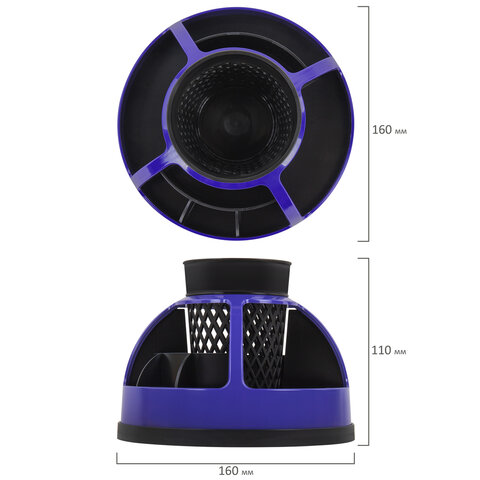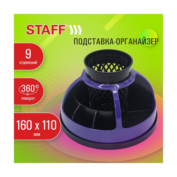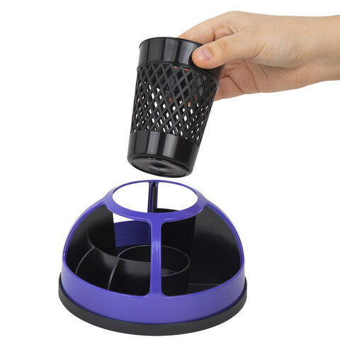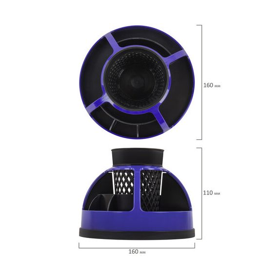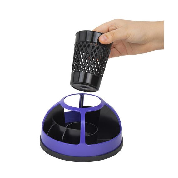 Эргономичная пластиковая подставка-органайзер размером 160х110 мм с 9 отделениями для пишущих принадлежностей и канцелярских мелочей. Легко вращается на 360 градусов. Поставляется без канцелярского наполнения.