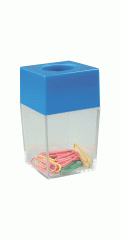 Удобный магнитный диспенсер для скрепок. Материал - прозрачный пластик. Цвета в ассортименте. Поставляется с никелированными скрепками 28 мм, 30 штук в комплекте. Индивидуальная упаковка в картонную коробочку с европодвесом.