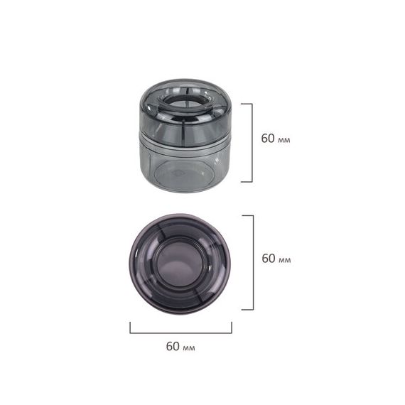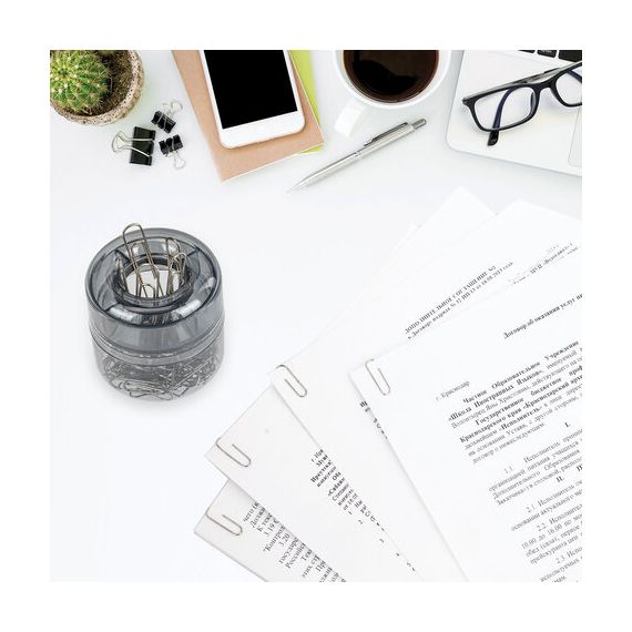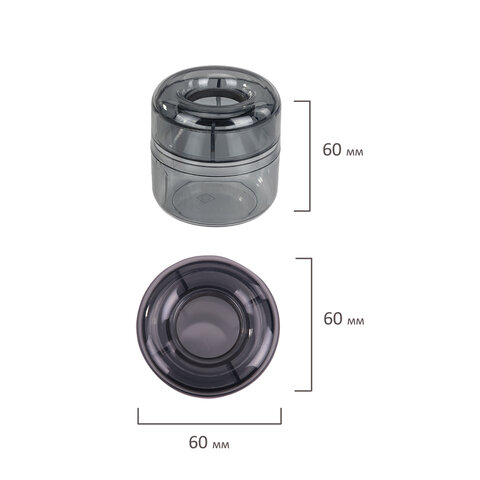 Скрепочница цилиндрической формы выполнена из тонированного пластика. Встроенный магнит предотвращает высыпание скрепок. Размер - 6 x 6 х 6 см.