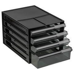 Блок из 4-х выдвижных лотков «СТАММ» предназначен для хранения бумаг формата А4 и канцелярских принадлежностей. На лотках есть ограничитель, препятствующий выпадению из корпуса. Предусмотрены окна для маркировок, облегчающие сортировку. Устойчивый и прочный корпус блока выполнен из ударопрочного пластика. Вместимость — до 1 100 листов. Блок представлен в чёрном цвете, лотки выполнены в тонированном чёрном цвете. Изделие высотой , глубиной - и шириной - .