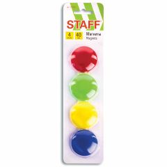 Магниты STAFF круглой формы большого диаметра с пластиковым покрытием для магнитно-маркерных досок. Диаметр магнита составляет 40 мм. 4 штуки в комплекте. Разноцветные магниты помогут надежно прикрепить листы бумаги к магнитно-маркерной поверхности досок, витрин и флипчартов. Надежно удерживаются на любой железной или стальной поверхности. Поставляются в удобной блистерной упаковке с европодвесом.