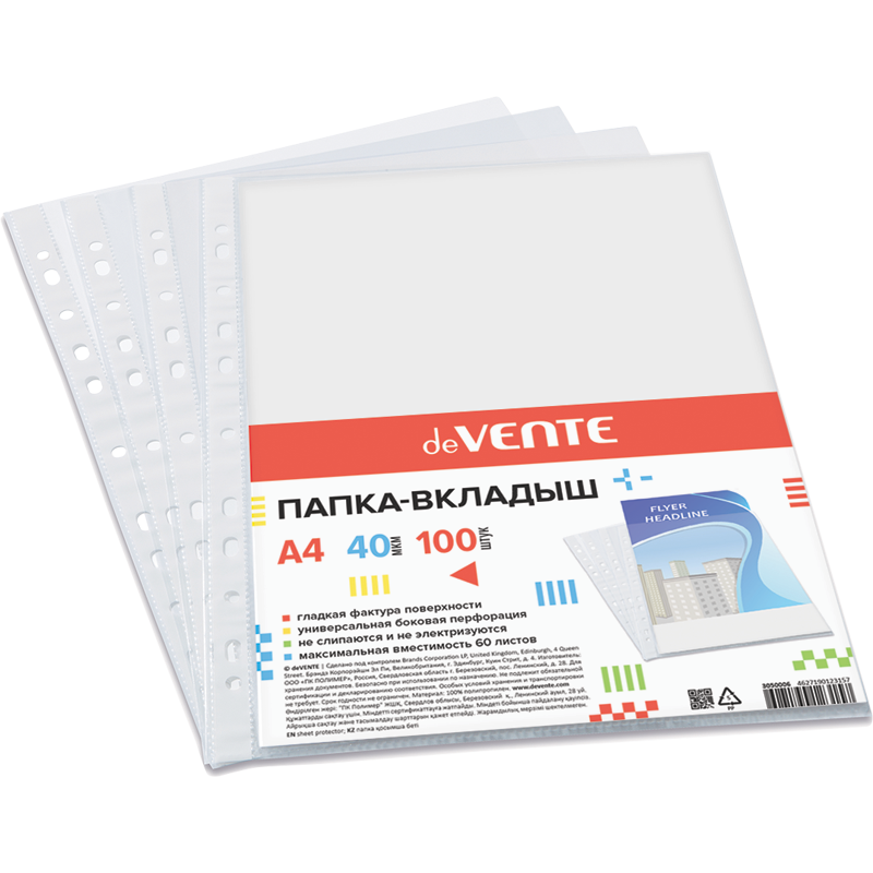 Папка-вкладыш "deVENTE" A4 40 мкм, гладкая фактура, с универсальной боковой перфорацией, 100 шт в уп