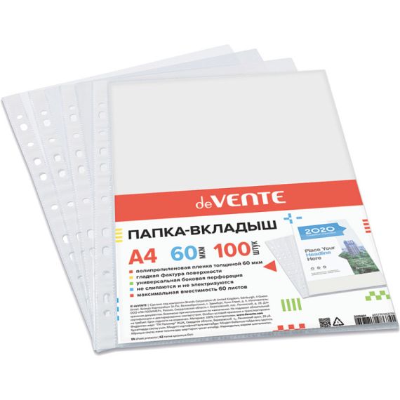 Папка-вкладыш "deVENTE" A4 60 мкм, гладкая фактура, с универсальной боковой перфорацией, 50 шт в уп