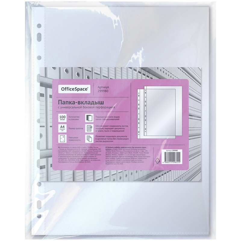 Бюджетные глянцевые прозрачные файлы-вкладыши OfficeSpace формата А4 размера 305*232 мм предназначены для хранения неперфорированных документов А4 в любых папках с кольцевым механизмом и скоросшивателем, и позволяют систематизировать и обеспечить сохранность документов. Вертикальная ориентация, вместимость файла до 50 листов бумаги. В упаковке 100 штук. Глянцевая поверхность и яркий информационный вкладыш в каждой групповой упаковке.