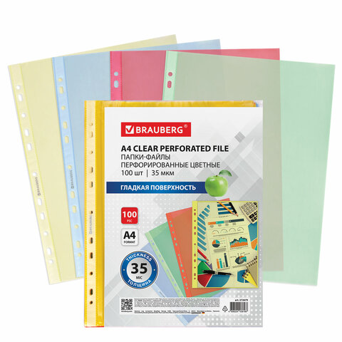 Цветные папки-файлы BRAUBERG – идеальное решение для упорядочивания документов. Они подходят для папок с любым кольцевым механизмом или скоросшивателем.