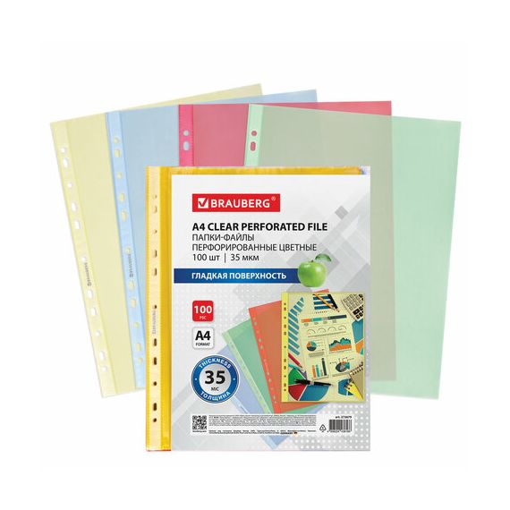 Папки-файлы перфорированные ЦВЕТНЫЕ ассорти А4 BRAUBERG, комплект 100 шт., гладкие, 35 мкм