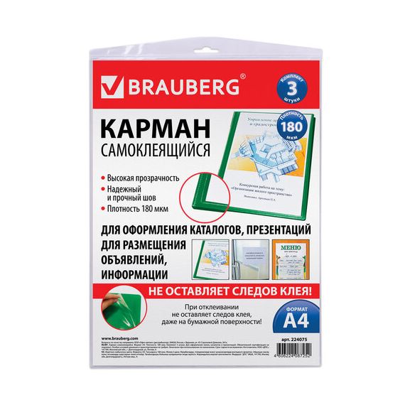 Самоклеящеся карманы BRAUBERG под листы формата А4 предназначены для нанесения информации на папки, размещения объявлений, меню и т.д.