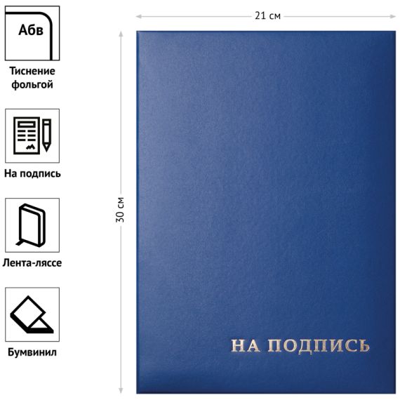 Папка адресная OfficeSpace серии «На подпись» формата А4 предназначена для подачи документов на подпись руководителю. Изделие выполнено из прочного картона синего цвета с покрытием из бумвинила. Обложка изделия украшена тиснением из фольги. Внутренний способ крепления документов – лента-ляссе. Размер товара: 220*310 мм. Папка выпускается в индивидуальной упаковке.