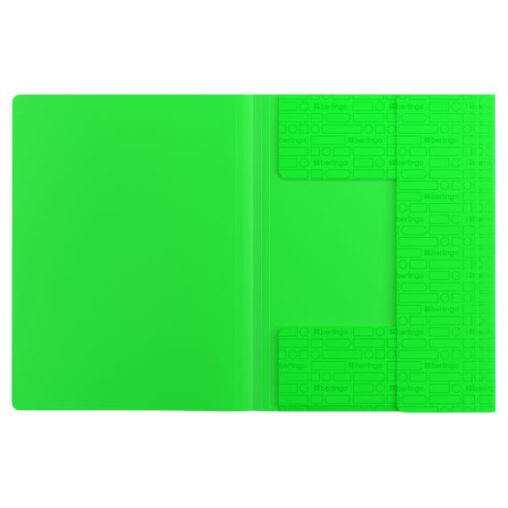 Папка изготовлена из высококачественного полипропилена с матовой текстурой поверхности с фирменным тиснением Berlingo, на которой не видно отпечатков пальцев и мелких царапин. Толщина обложки 600 мкм. Надёжные застёжки-резинки помогают избежать повреждения документов и легко открываются. Упакована в индивидуальный прозрачный пакет по форме.
