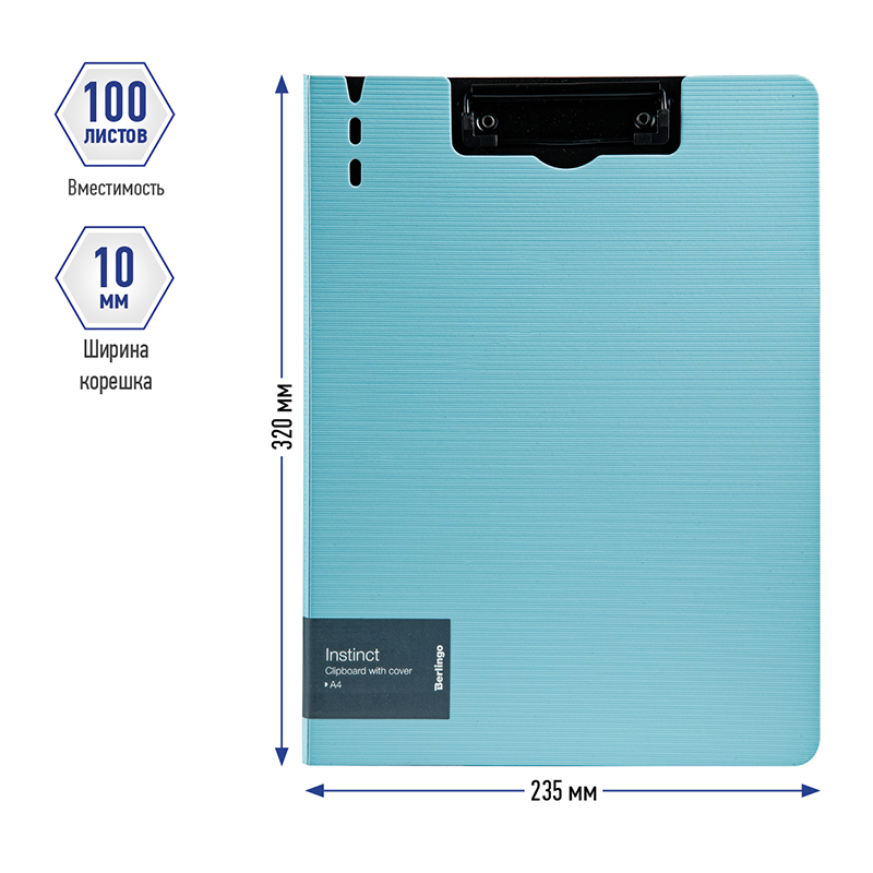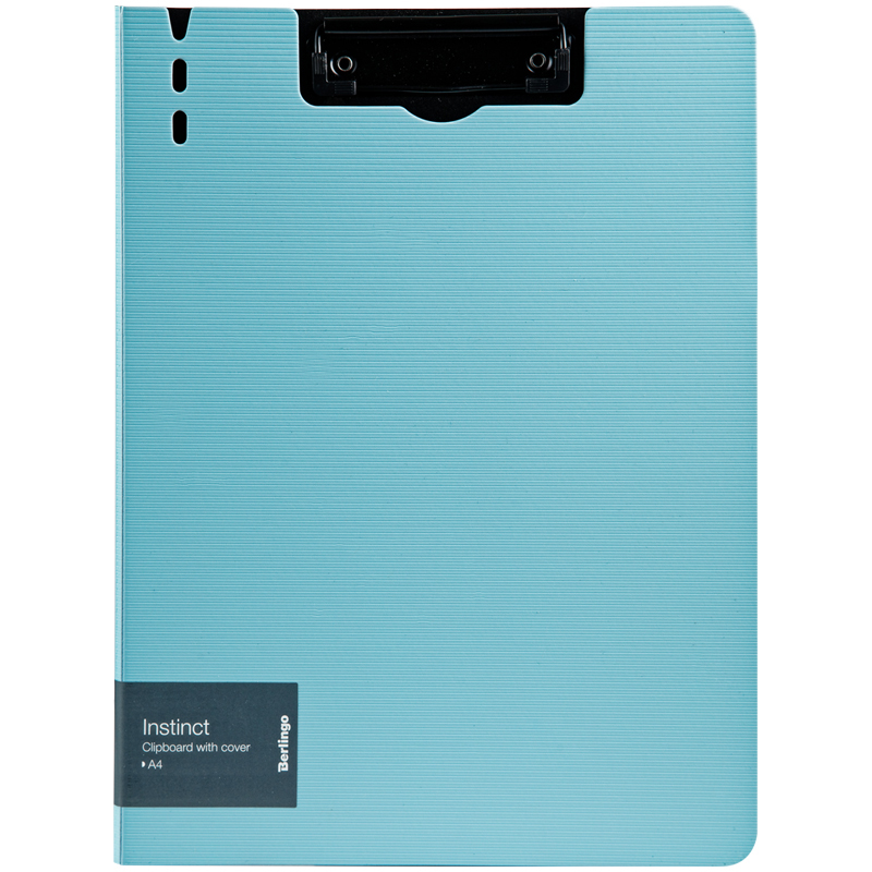 Папка-планшет с зажимом Berlingo серии Instinct размером 320*225 мм изготовлена из плотного пластика (полифом) толщиной 1,8 мм. Вместимость папки – 100 листов, ширина корешка – 10 мм. Насыщенный пастельный голубой цвет внешней стороны в сочетании с фактурой "горизонтальные линии", черный цвет внутренней поверхности с прижимом. Металлический зажим для фиксации документов. Вырубки на крышке позволяют легко закрепить ручку на папке. Позволяет делать записи на весу. Индивидуальная упаковка в пакет.