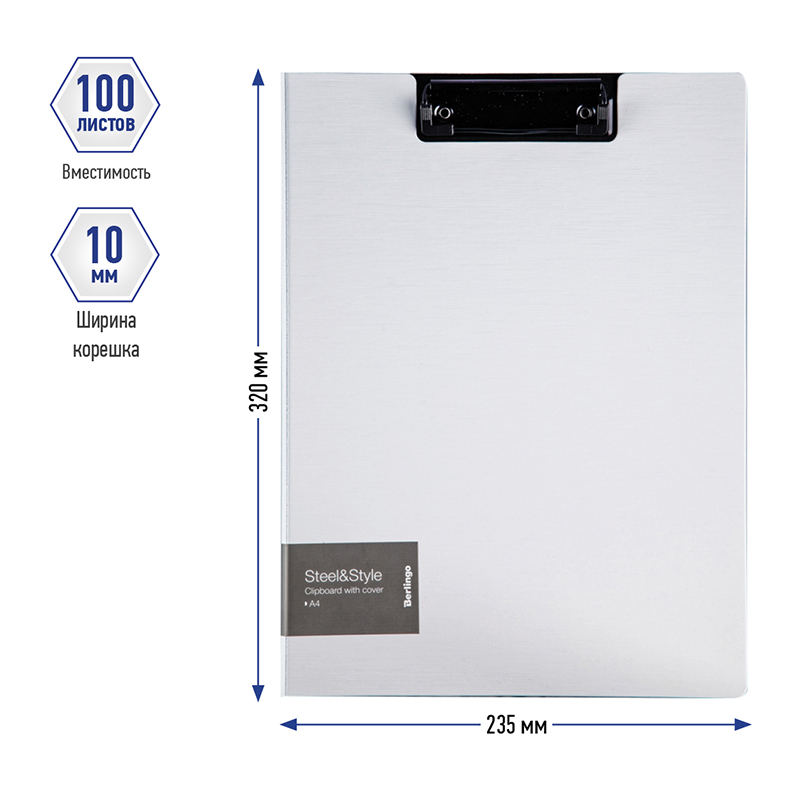 Стильная и удобная папка-планшет с прижимом Berlingo серии Steel&Style формата А4 позволяет делать записи на весу. Изготовлена из полифома толщиной 1800 мкм. Вмещает до 100 листов. Ширина корешка - 10 мм. Папка-планшет имеет насыщенный белый цвет внешней стороны в сочетании с фактурой "сталь" и чёрный цвет внутренней поверхности с чёрным прижимом. Металлический зажим надёжно фиксирует документы, не повреждая их. Размер папки-планшета - 320*235 мм. Упакована в индивидуальный пакет с липким краем.