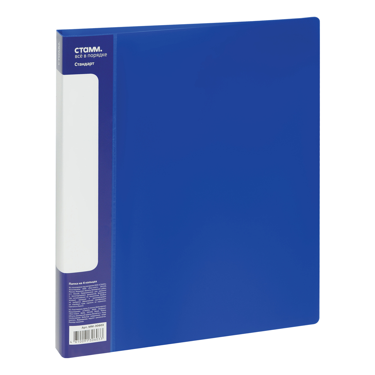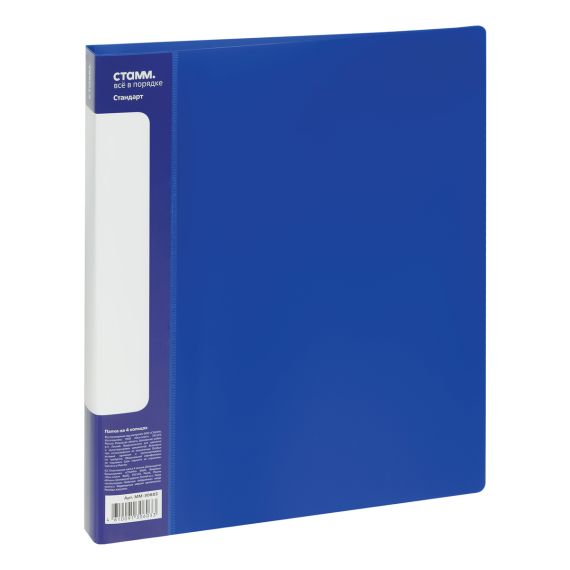 Папка на 4 кольцах «СТАММ» серии «Стандарт» предназначена для хранения перфорированных документов формата А4. Цвет папки – синий. Изготовлена из качественного полипропилена толщиной 700 мкм с текстурой «песок». Размер изделия составляет 250*305 мм. Ширина корешка 25 мм позволяет вмещать в папку до 120 листов. Кольцевой механизм, состоящий из 2 колец диаметром 16 мм, надежно держит документы. На корешке и внутренней стороне папки имеется карман. Папка упакована в индивидуальный пакет.