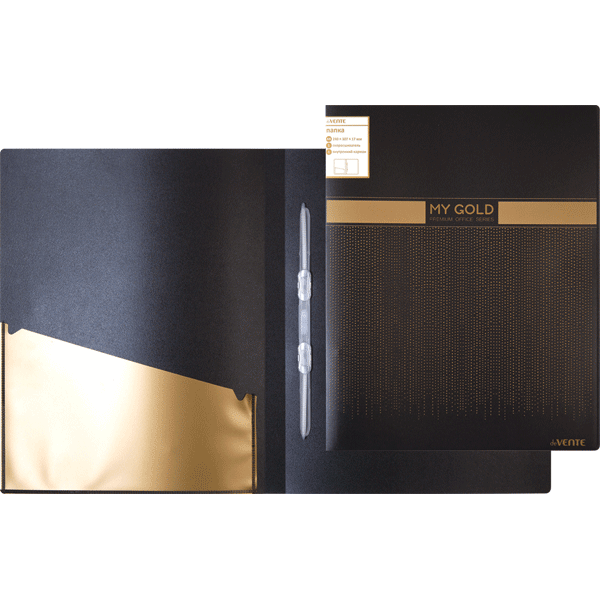 Папка с пластиковым скоросшивателем "deVENTE. My Gold" 240x307x17 мм, 700 мкм, фактура "песок" на 100 листов бумаги, внутренний карман 160 мкм, индивидуальная маркировка, непрозрачная черная