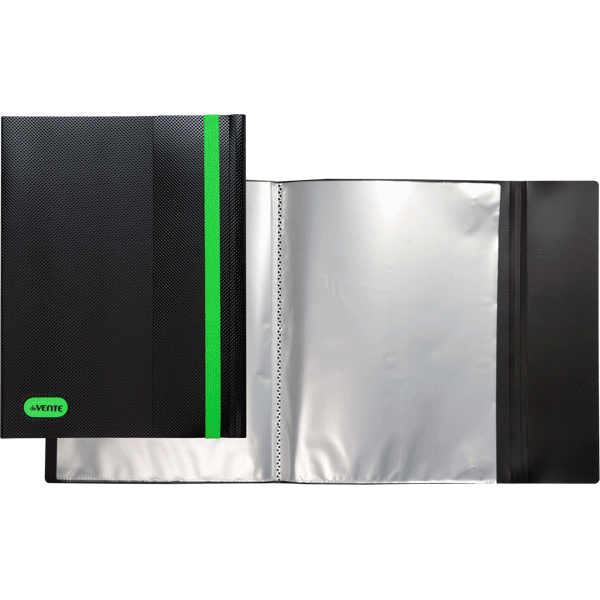 Папка с 20 вкладышами A4 "deVENTE. MonoChrome" A4 (215x310x20 мм) 500 мкм, с рельефной фактурной поверхностью, вкладыши 30 мкм, вертикальная неоновая зеленая резинка 15 мм, индивидуальная маркировка, непрозрачная черная с неновым зеленым