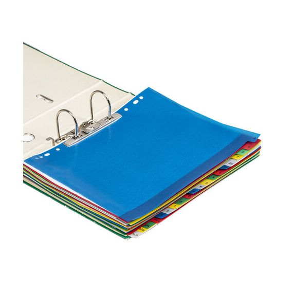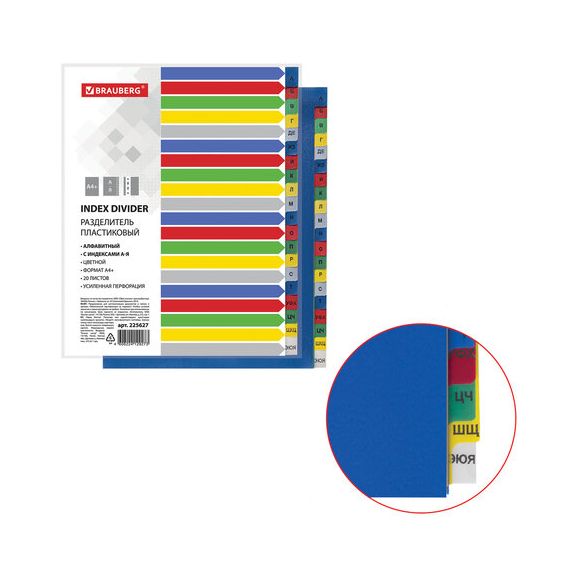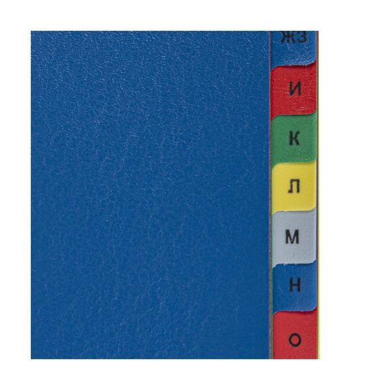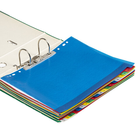 Изготовлены из пластика толщиной 0,12 мм. В комплект входят 20 листов синего, красного, серого, зеленого и желтого цвета, обеспечивающих возможность сортировки документов по алфавиту, а также титульный лист для оглавления. Универсальная перфорация позволяет подшивать разделители во все типы папок. Размер - 246х305 мм.