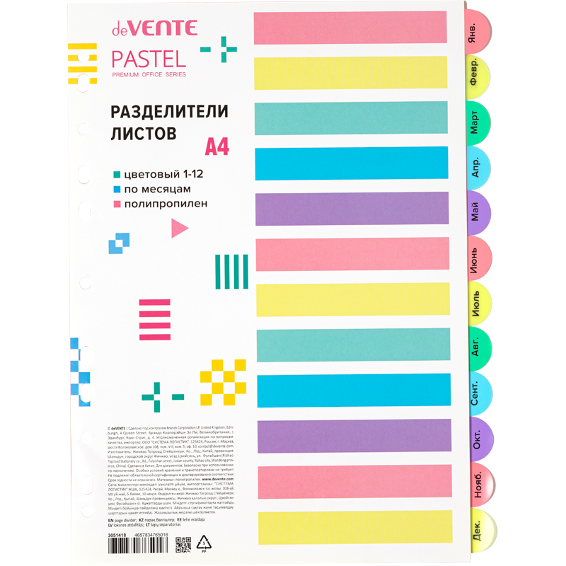 Разделитель листов "deVENTE. Pastel" A4 (223x296 мм) полипропилен 140 мкм, цветовой, по месяцам, 12 шт, индивидуальная упаковка