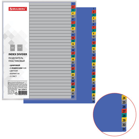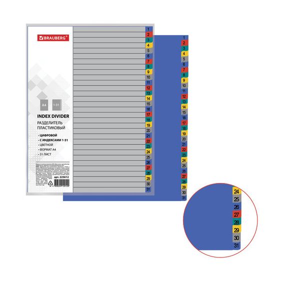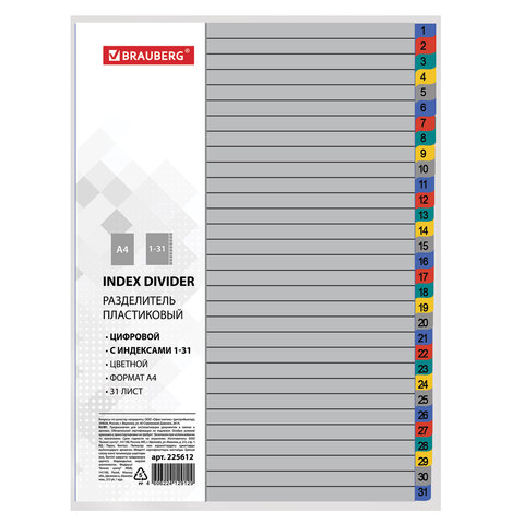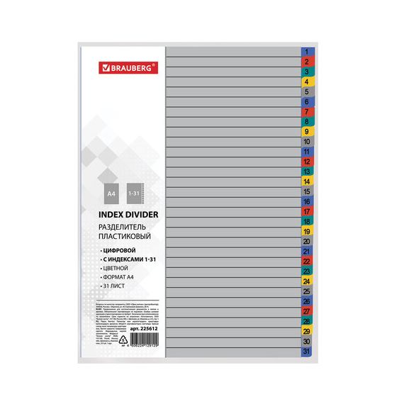 Изготовлены из пластика толщиной 0,12 мм. В комплект входит 31 лист синего, красного, серого, зеленого и желтого цвета, обеспечивающих возможность сортировки документов по цифрам, а также титульный лист для оглавления. Универсальная перфорация позволяет подшивать разделители во все типы папок. Размер - 224х297 мм.