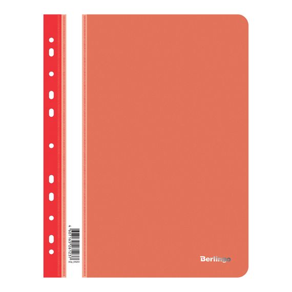 Папка-скоросшиватель Berlingo формата А4 – это удобный аксессуар для работы и учебы, выполненный в насыщенном красном цвете. Папка-скоросшиватель с прозрачным верхним листом размером 310*240 мм изготовлена из плотного пластика толщиной 180 мкм. У папки есть дополнительная универсальная перфорация, которая позволяет подшивать скоросшиватель в папки-регистраторы и папки на кольцах. Также присутствует усиленный пластиковый корешок с индексной полосой для размещения информации. Вместимость папки – 100 листов.