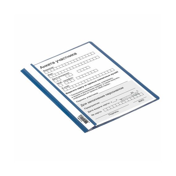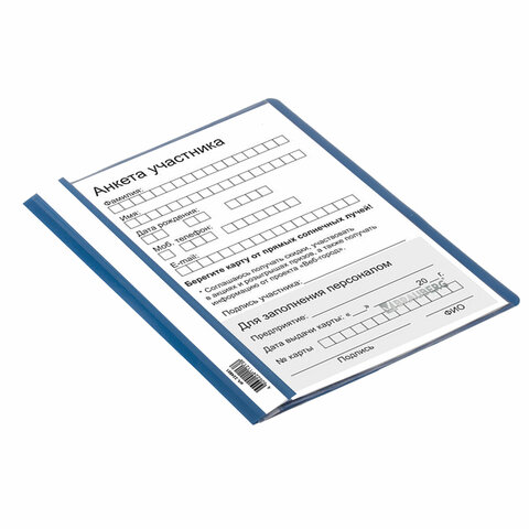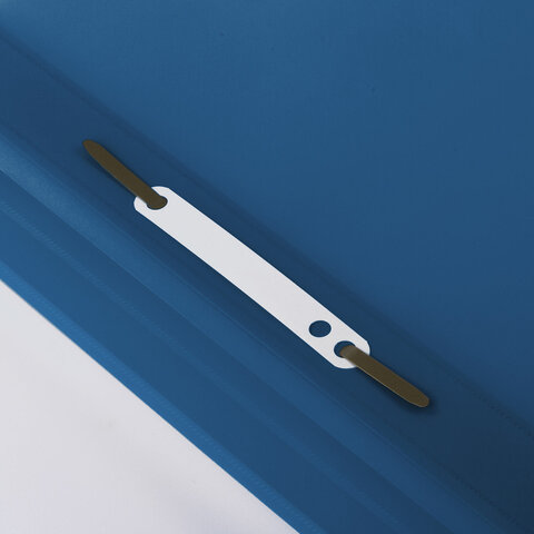 Фиксирует до 100 листов формата А5. Толщина пластика верхнего листа составляет 130 мкм, а нижнего - 180 мкм. Предельно простой механизм подшивки: металлические усики и пластиковая планка для надежной фиксации документов. Скоросшиватель изготовлен из качественного полипропилена. Прозрачный верхний лист позволяет определить содержимое, не открывая скоросшиватель, который к тому же снабжен сменным пластиковым корешком, что дает возможность структурировать информацию. Благодаря фактуре "песок" и насыщенному синему цвету обложки папка никогда не затеряется на полке.
